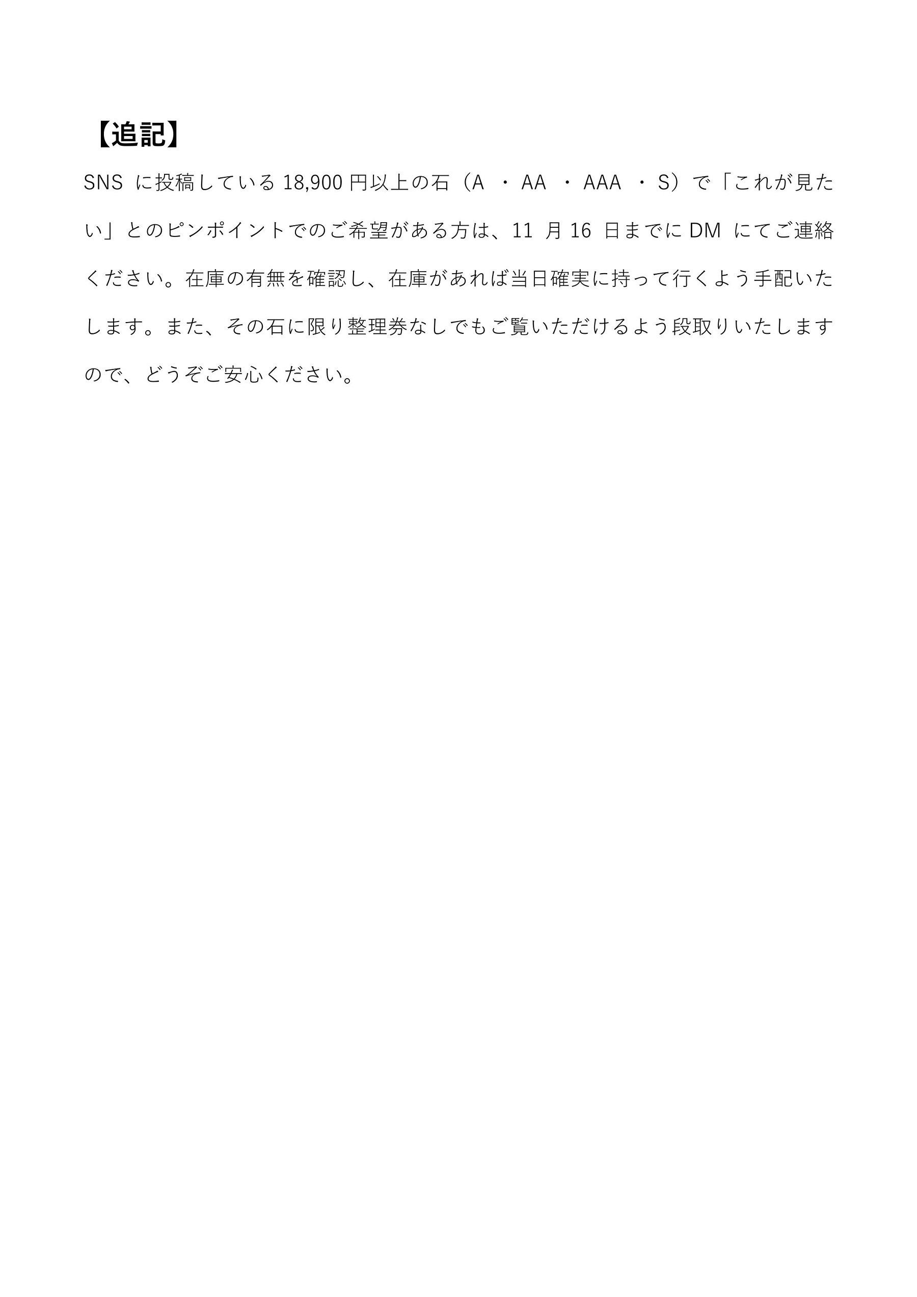 また、一部AAA~Sクラスの即売は予定しておらず、購入希望予約の受付のみを行う予定でおります。